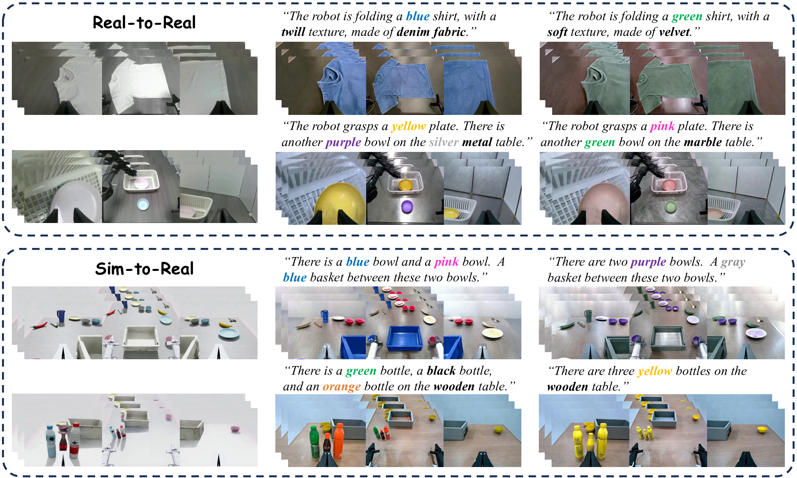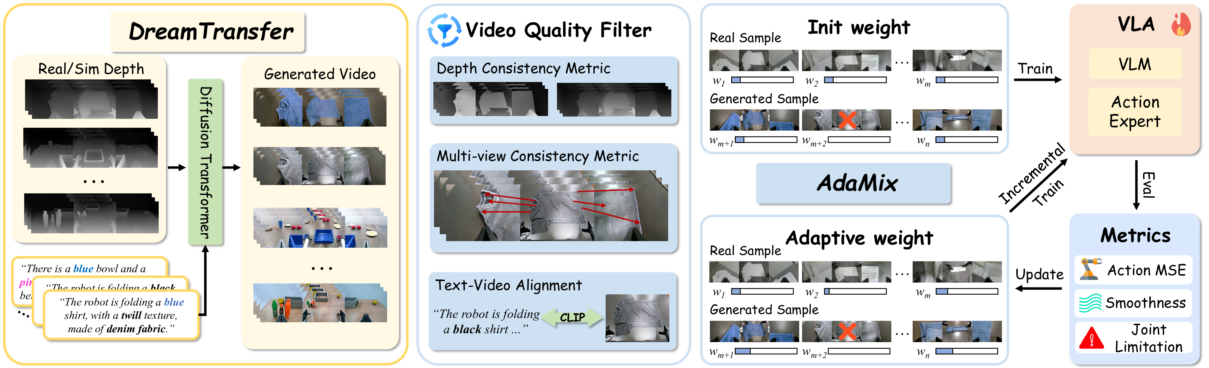 Overview of the EMMA framework. First, DreamTransfer generates multi-view consistent videos by performing text-controlled visual editing of the foreground, background, and lighting conditions, conditioned on depth and corresponding text prompts. The generated videos are then evaluated by a video quality filter. Low-quality videos are initially assigned zero sampling weight to stabilize early-stage training. The AdaMix module further adaptively reweights training samples based on trajectory performance metrics, up-weighting challenging samples to improve policy robustness and generalization.